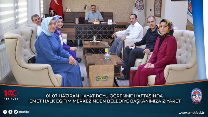 01-07 Haziran Hayat boyu öğrenme haftasında Emet Halk Eğitim müdürü Süleyman Avcı ve Halk eğitim müdürlüğümüz öğretmenleri Belediye başkanımız Hüseyin Doğan'ı makamında ziyaret ettiler.Müdür Avcı Hayat boyu öğrenme haftası etkinlikleri hakkında belediye başkanımız Hüseyin Doğan'ı bilgilendirirken,kursiyerlerce yapılan eserlerden belediye başkanımzı Hüseyin Doğan'a takdim ettiler