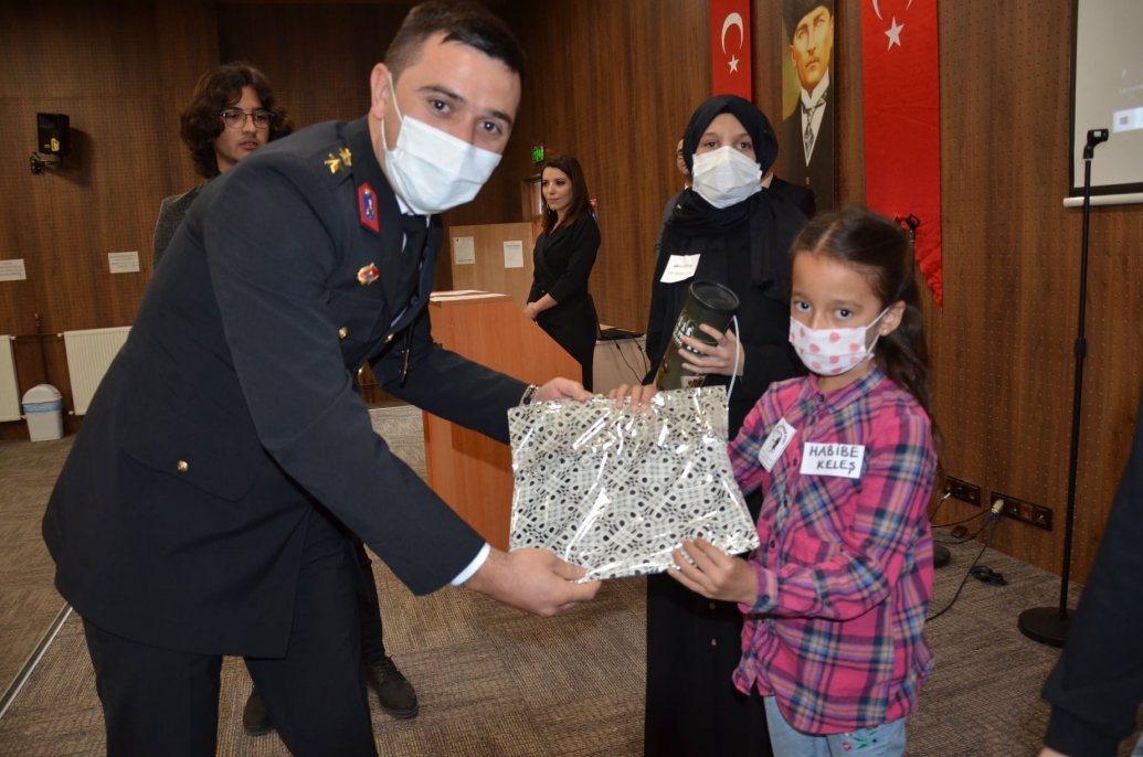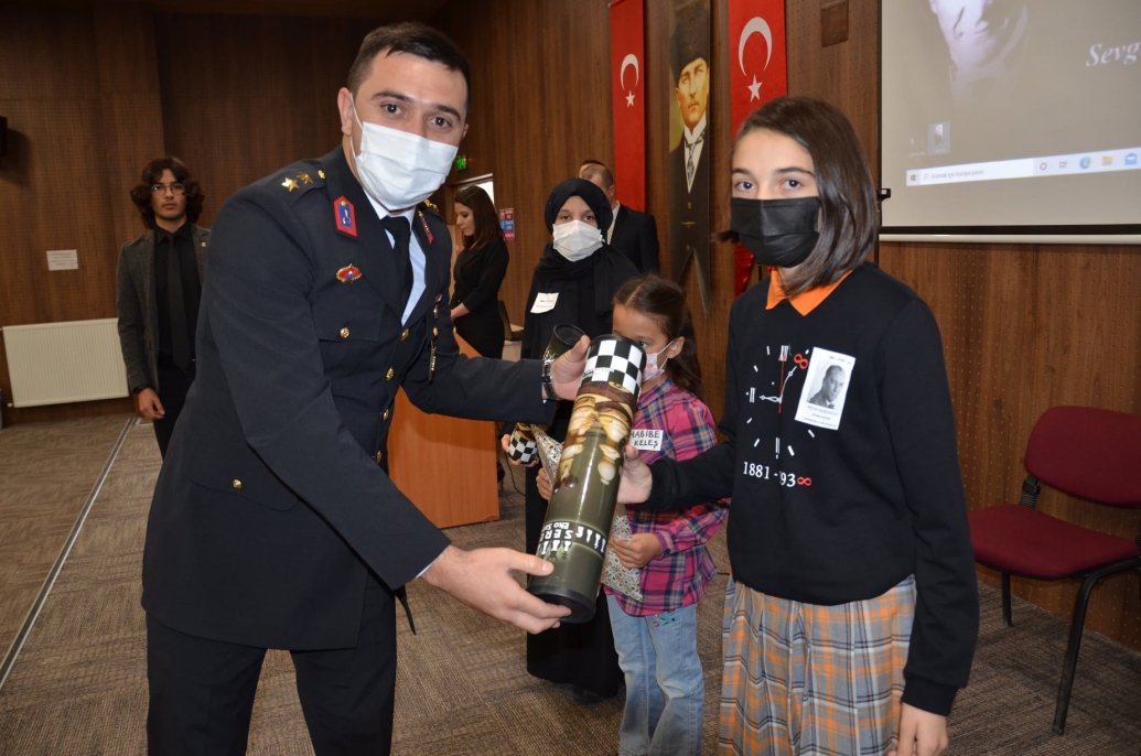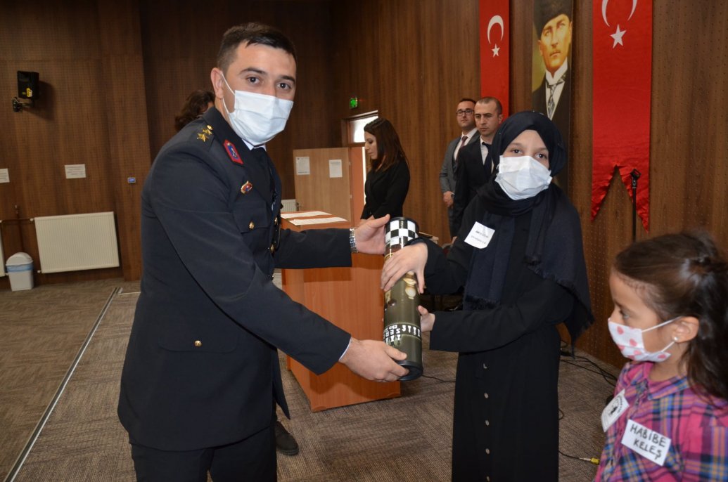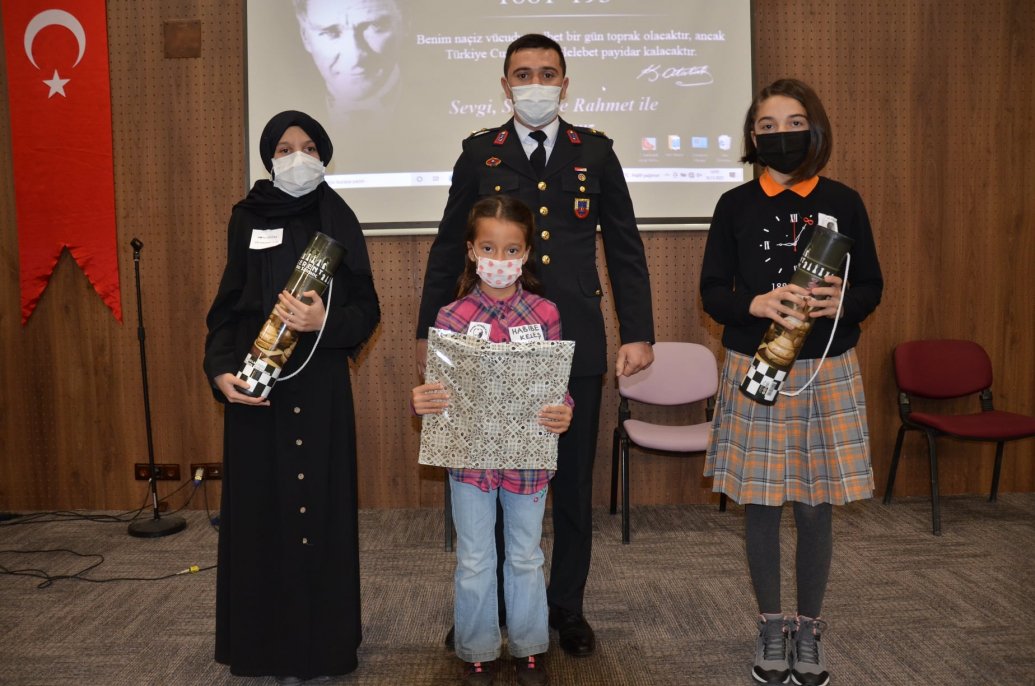 Resim yarışması üçüncüsü Gazi Kemal İlkokulu öğrencisi Habibe Keleş, Afiş yarışması üçüncüsü Ashaboğlu Ortaokulu öğrencisi Zeynep Akdaş, Şiir yarışması üçüncüsü Anadolu İmam Hatip Lisesi öğrencisi Emine Öztürk’e ödüllerini İlçe jandarma komutanı Neşet Öztürk takdim etti.