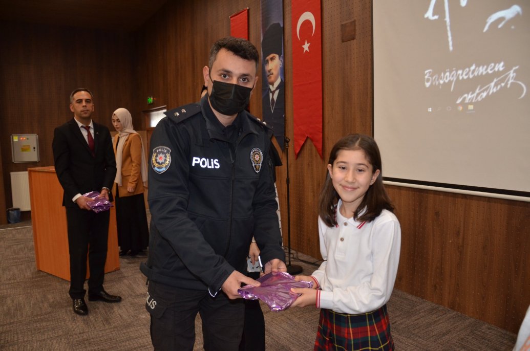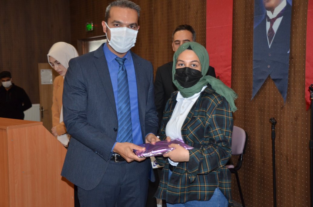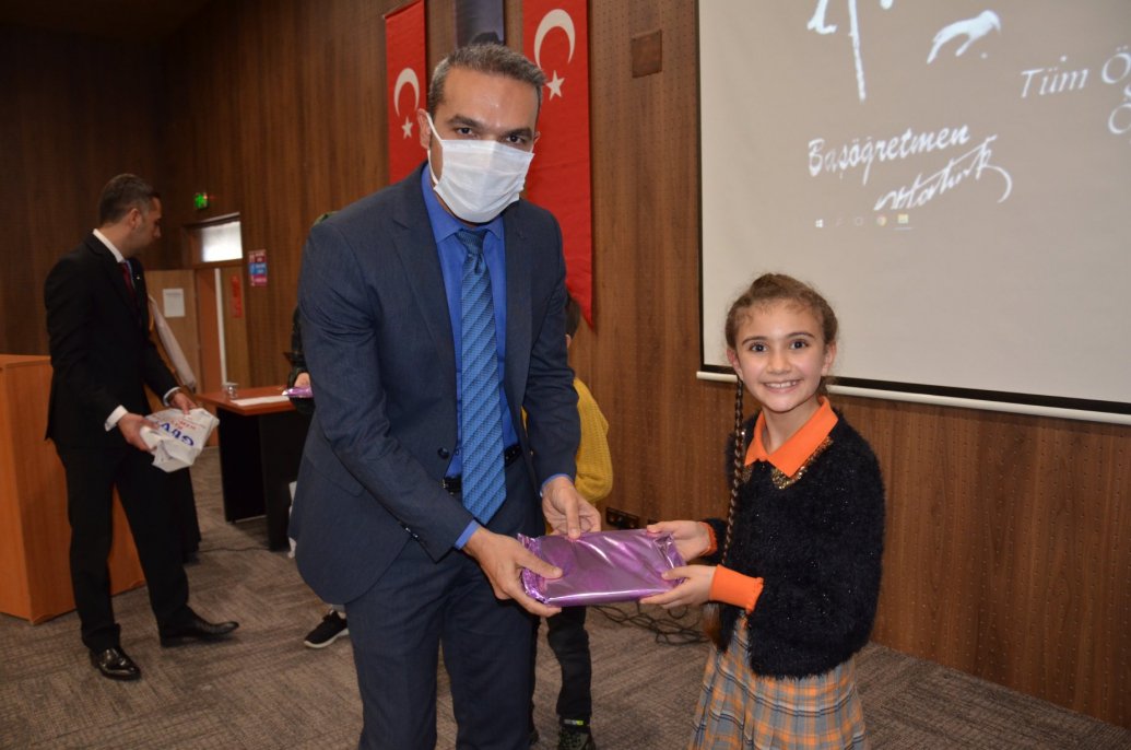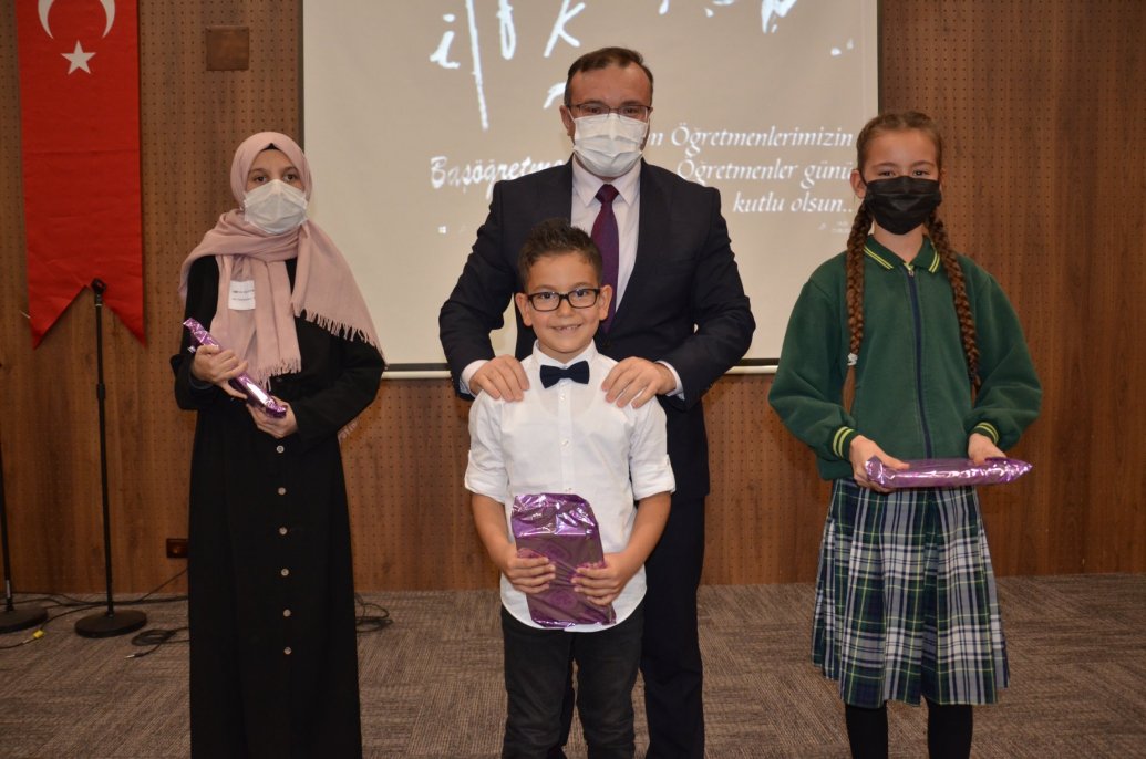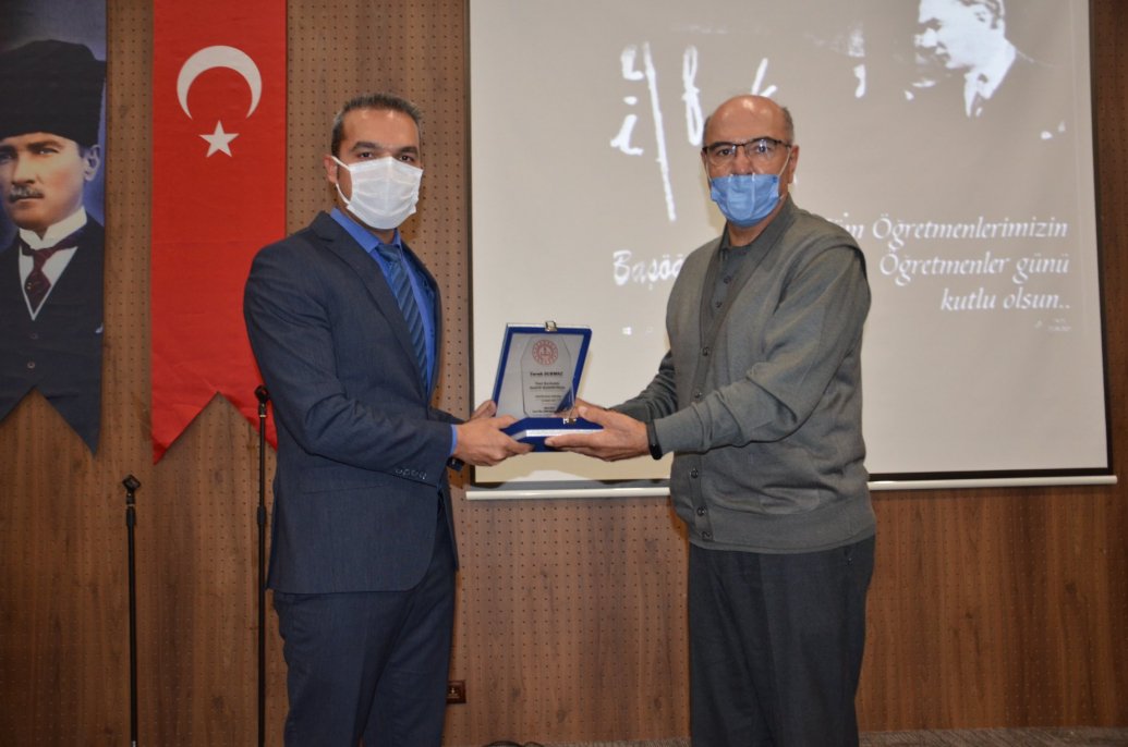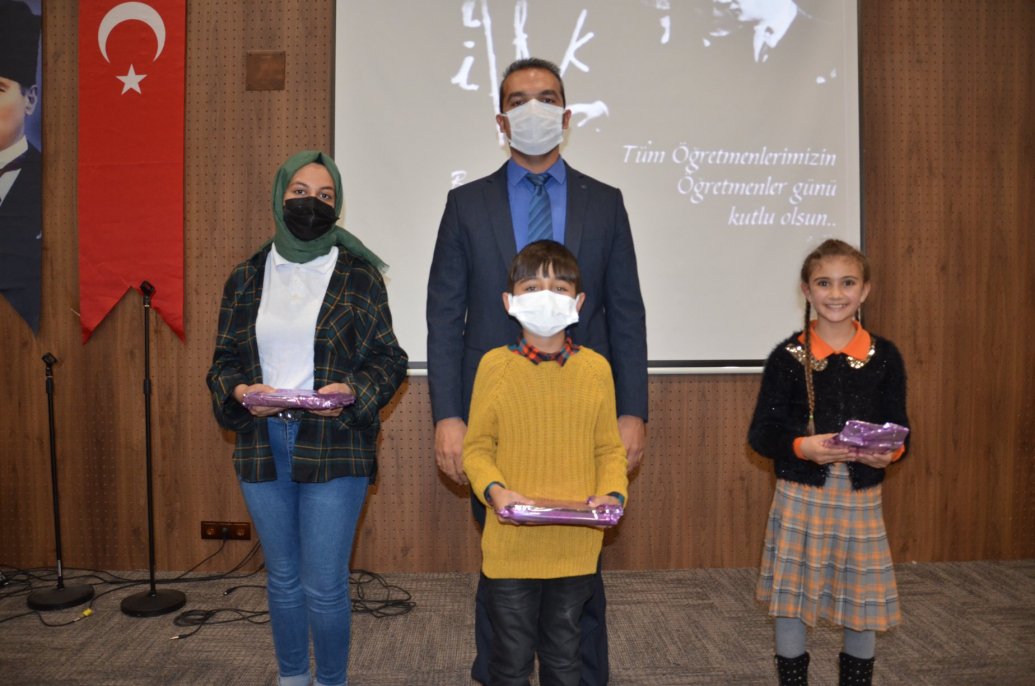 Öğretmenler haftası nedeniyle düzenlenen şiir, kompozisyon yarışmalarında dereceye giren öğrencilere protokol üyelerince hediyelerinin verildiği programda Emekli öğretmenleri temsilen Emekli Öğretmen Faruk Durmaz'a plaket takdim edildi.