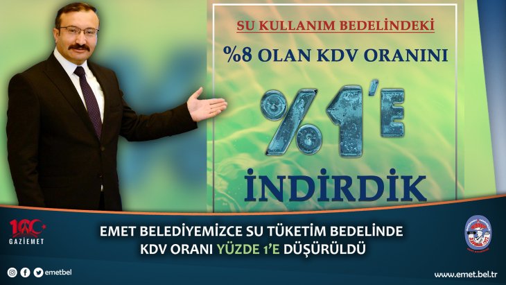 Belediye Başkanımız Hüseyin Doğan Kdv indirimi hakkında yaptığı açıklamada, yeni fiyatlandırmanın uygulanmaya başladığını bildirerek, " Cumhurbaşkanımız Sayın Recep Tayyip Erdoğan’ın temel gıda ürünlerindeki KDV oranının %1’e düşürülmesi yönündeki resmî gazetede yayınlanan kararının ardından Emet Belediyemiz olarak sudaki Kdv oranını %1’e düşürme kararını aldık