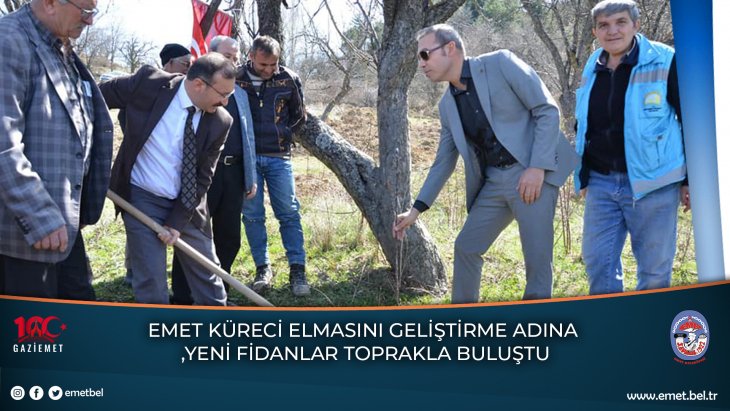Emet İlçe Tarım Müdürlüğü tarafından gerçekleştirilen Küreci elmasının yetiştirilmesi ve yaygınlaştırılması amacı ile dikilen elma fidanları toprakla buluşturuldu.Kaymakam Çiçek ve Belediye Başkanımız Hüseyin DOĞAN dikim töreninde fidan diktiler.Diğer fidanlarında dikiminde yer alan Kaymakam Hasan ÇİÇEK, sohbet ortamında gerçekleştirdiği konuşmasında; “Küreci elması projesi kapsamında dikilen elma fidanlarının hayırlı olmasını diliyorum. Dikilen bu fidanlar eskisi gibi tekrar yetişerek ve önemli bir gelir kaynağı olacağını düşünüyorum. Bizler de bu projenin ilerlemesi için elimizden gelen desteği vereceğiz” dedi.