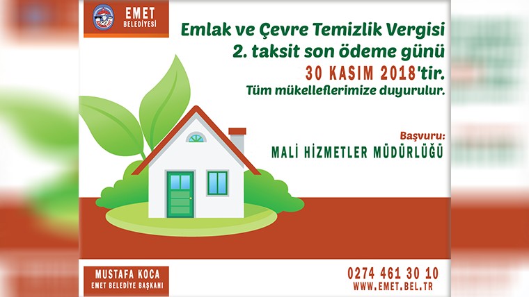 Emet Belediyesi Mali Hizmetler Müdürlüğü’nden yapılan açıklamaya göre, yılda iki dönem olarak taksitlendirilen Emlak Vergisi ve iş yerlerine ait Çevre Temizlik Vergisi ile İlan Reklam Vergisinin 2018 yılına ilişkin ikinci taksit ödeme süresi, Kasım ayı sonu itibariyle sona eriyor.